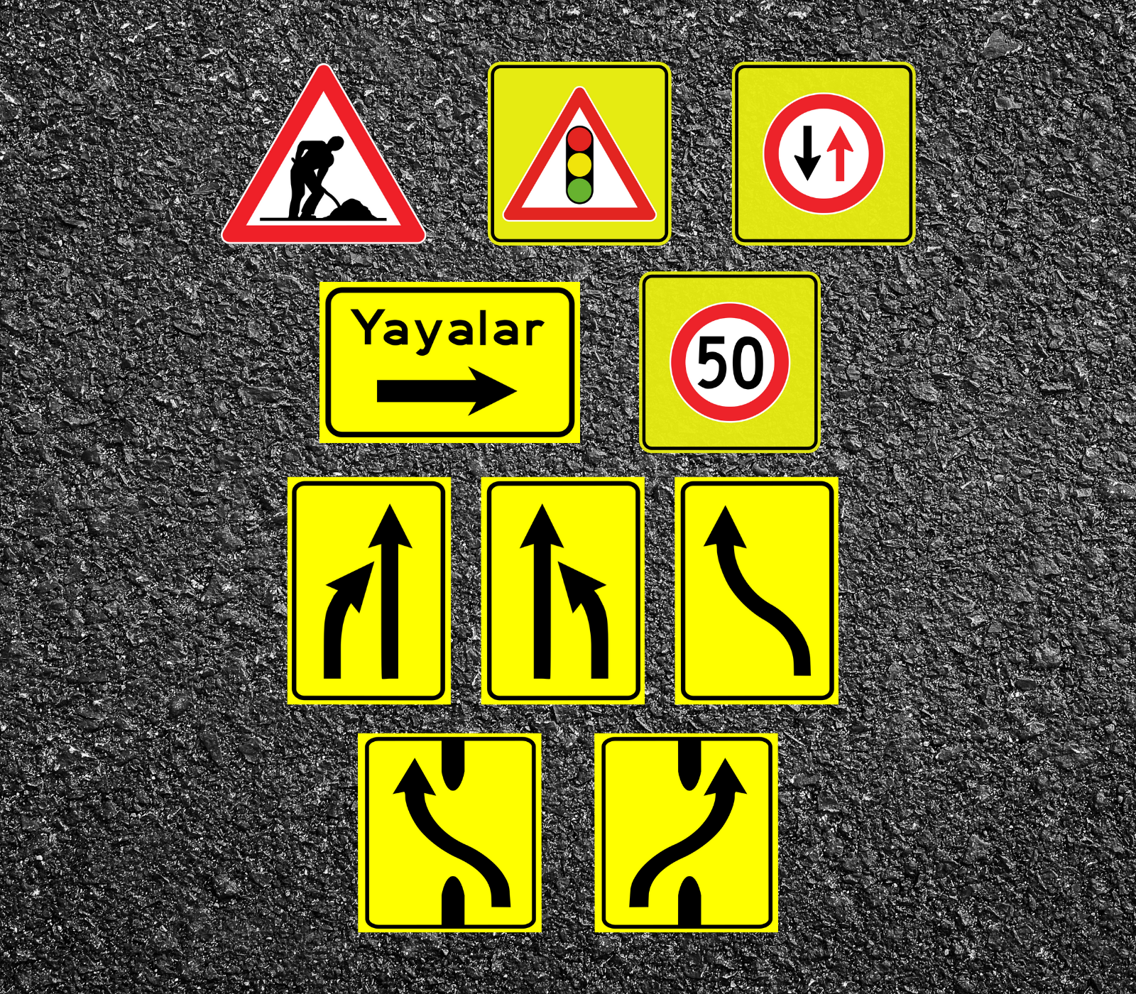 Yapım, bakım ve onarım işaretleri, yol üzerinde devam eden inşaat, bakım ve onarım çalışmalarını gösterir.